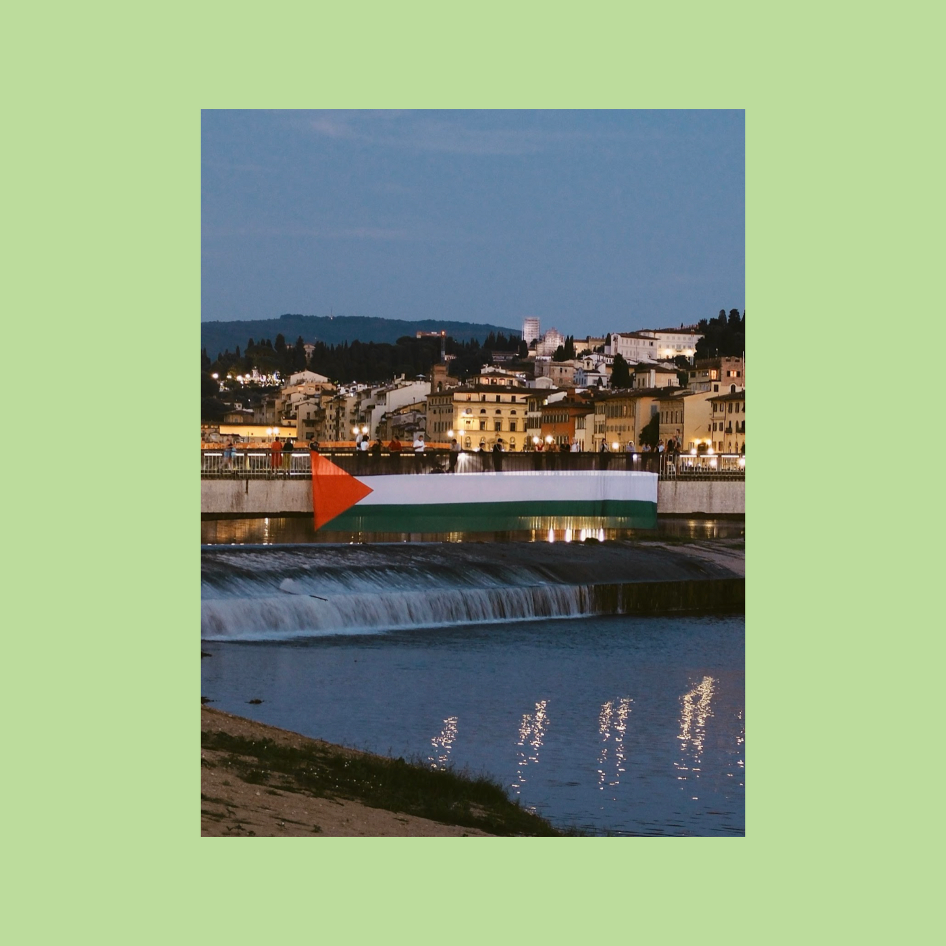 Postcard of a Palestinian flag displayed during a protest over the Arno River, Florence, Italy.