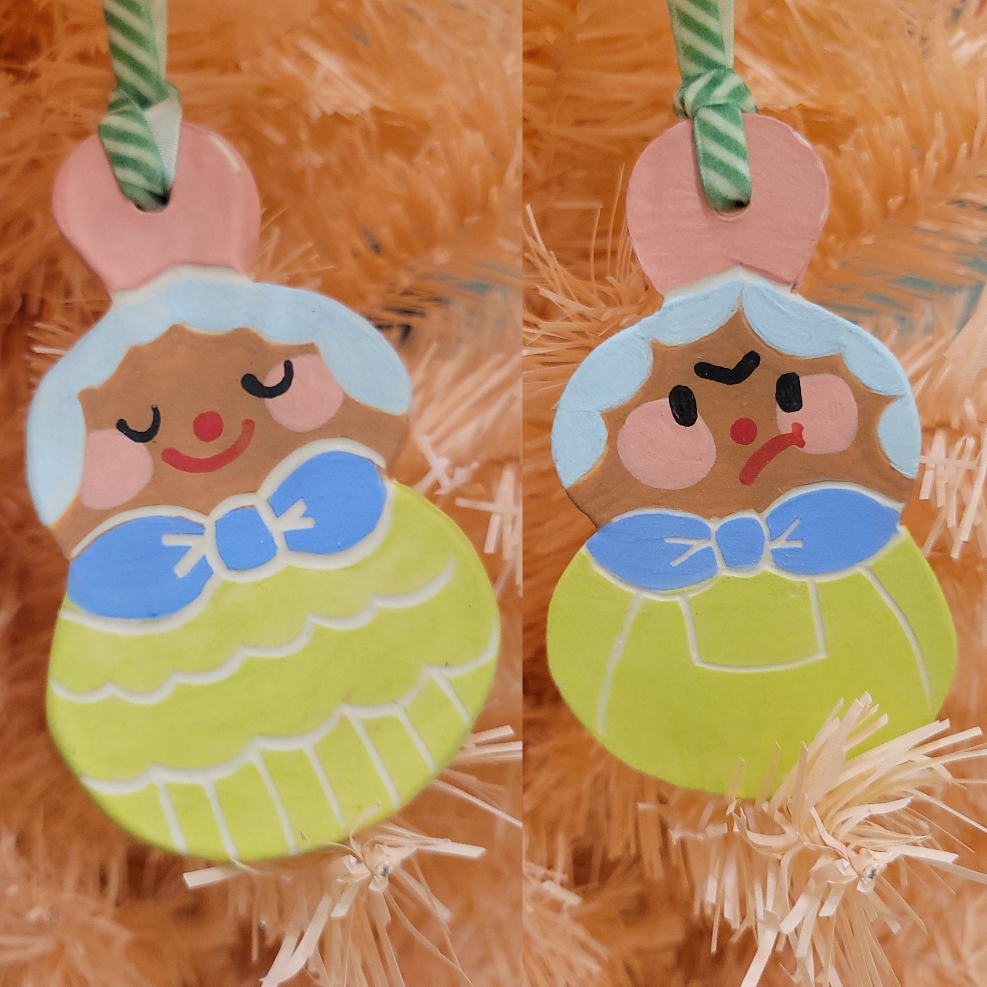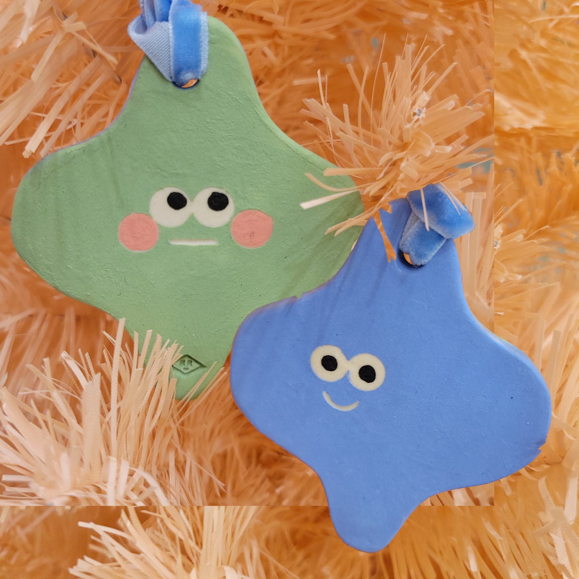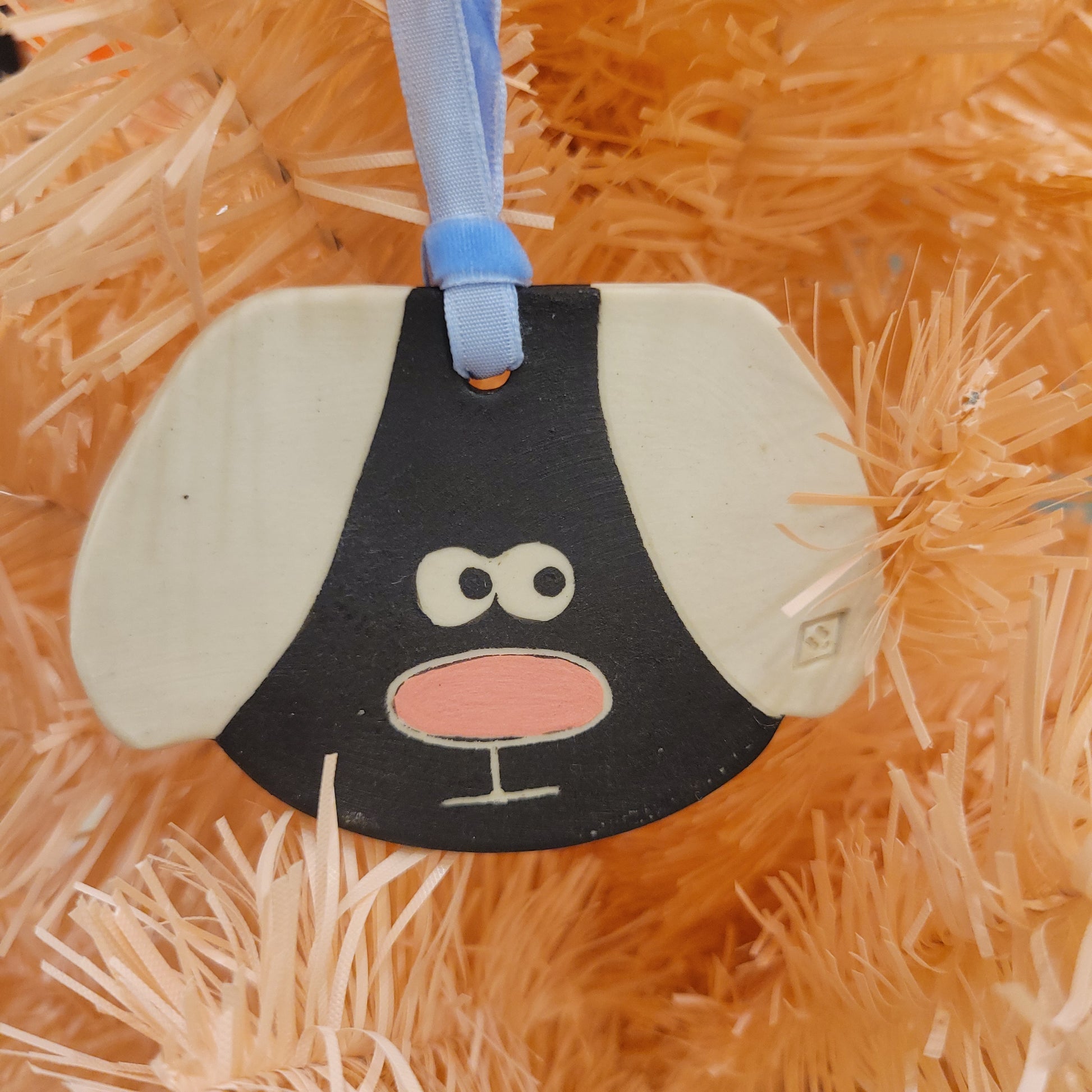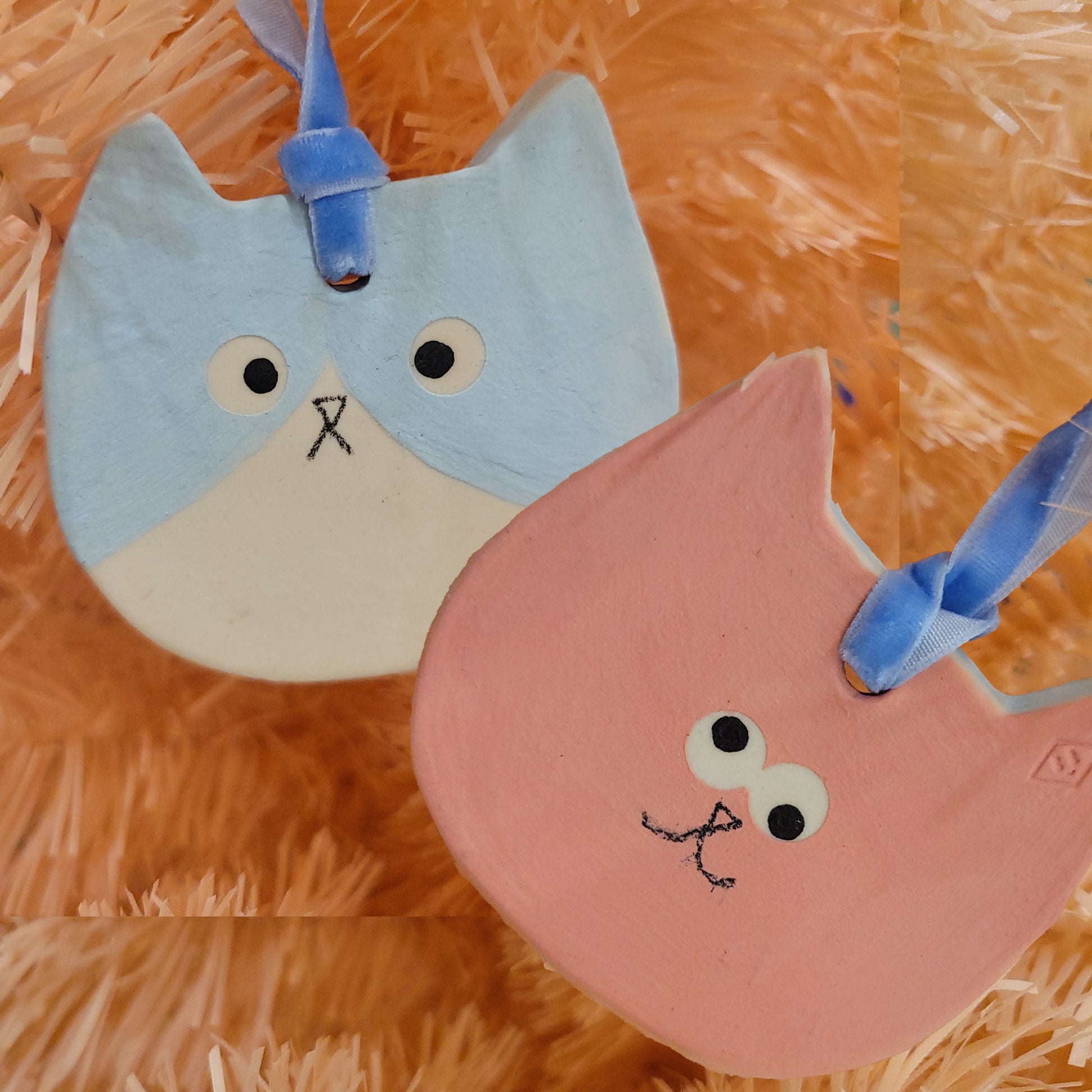 Each handmade ceramic ornament is double-sided and comes with a velvet hanging ribbon.