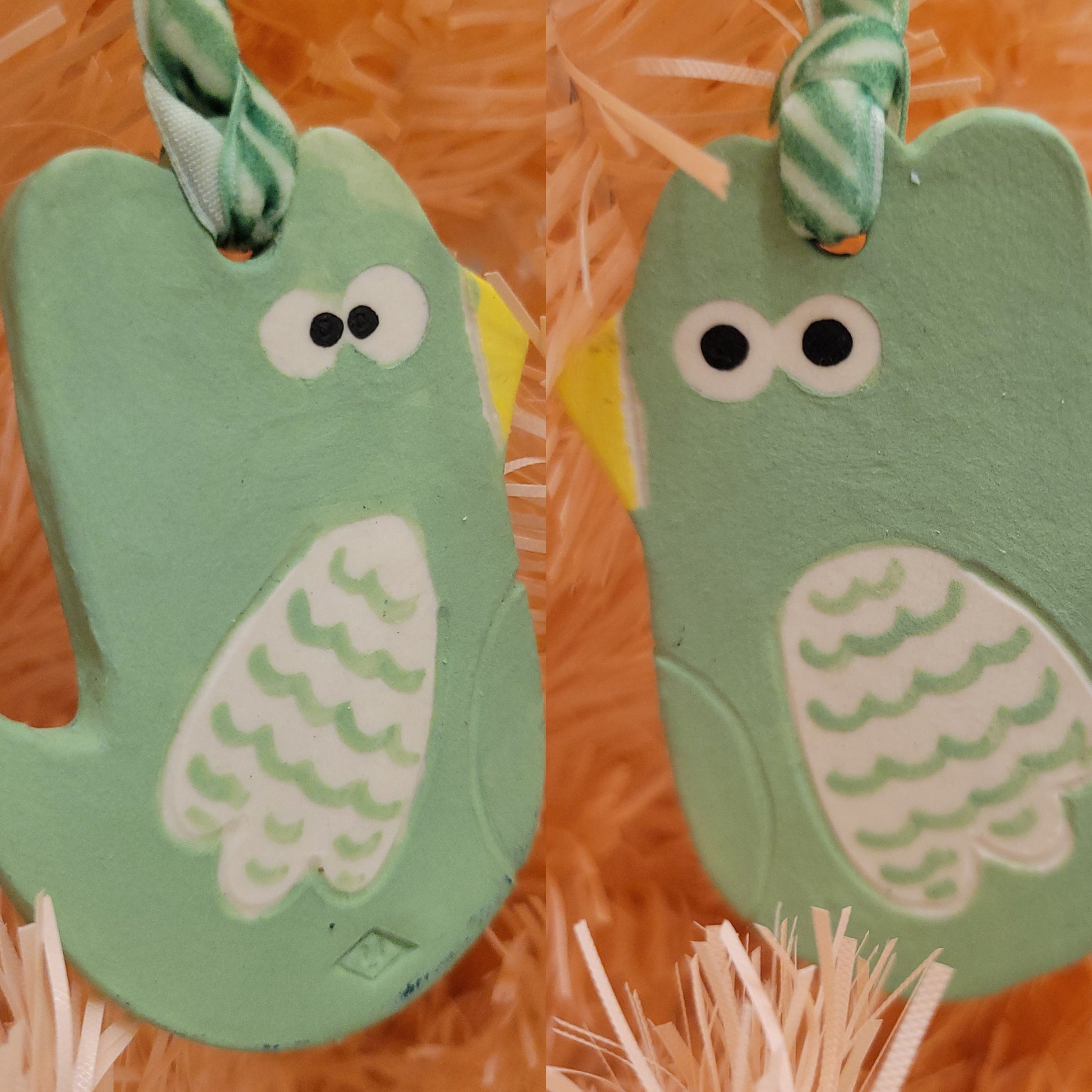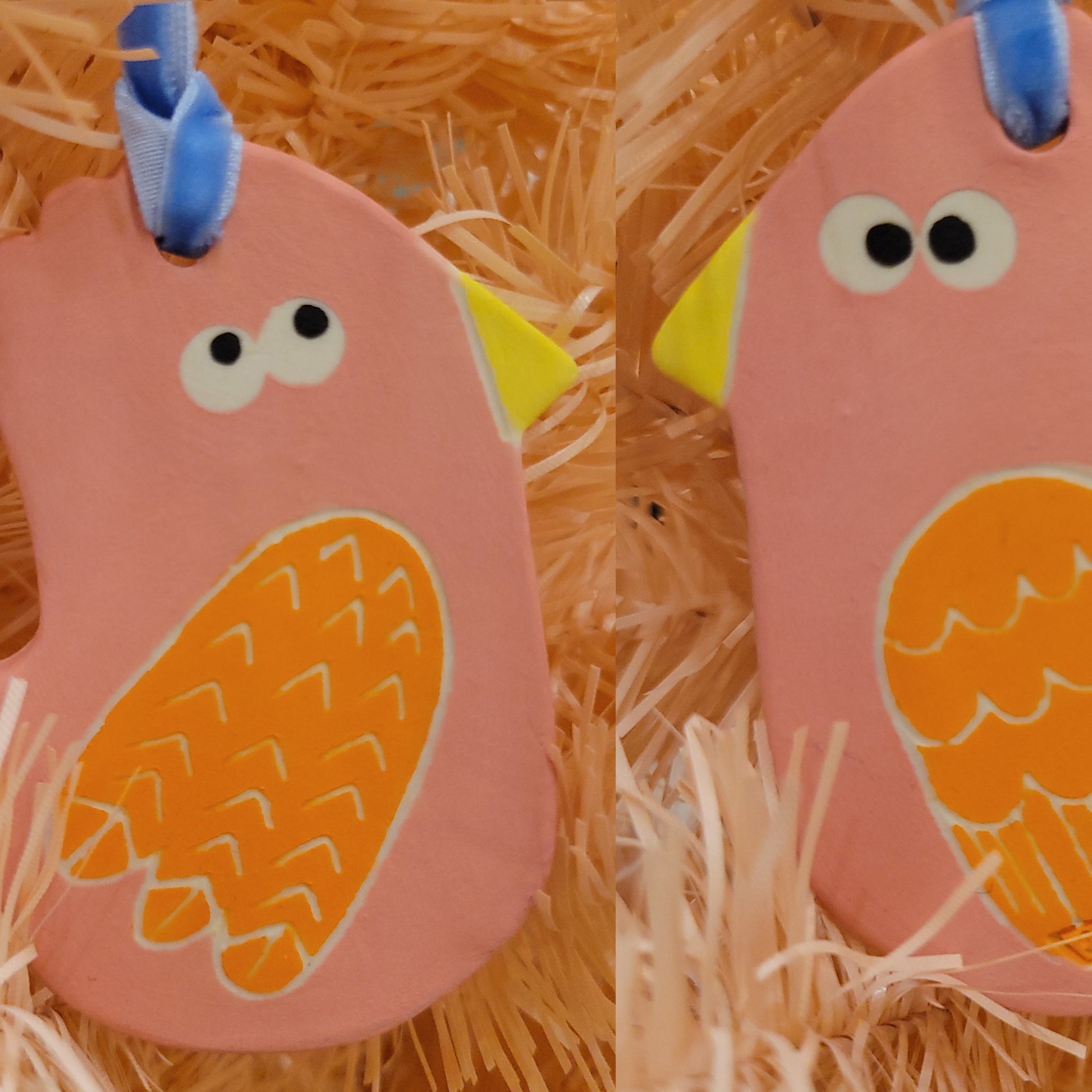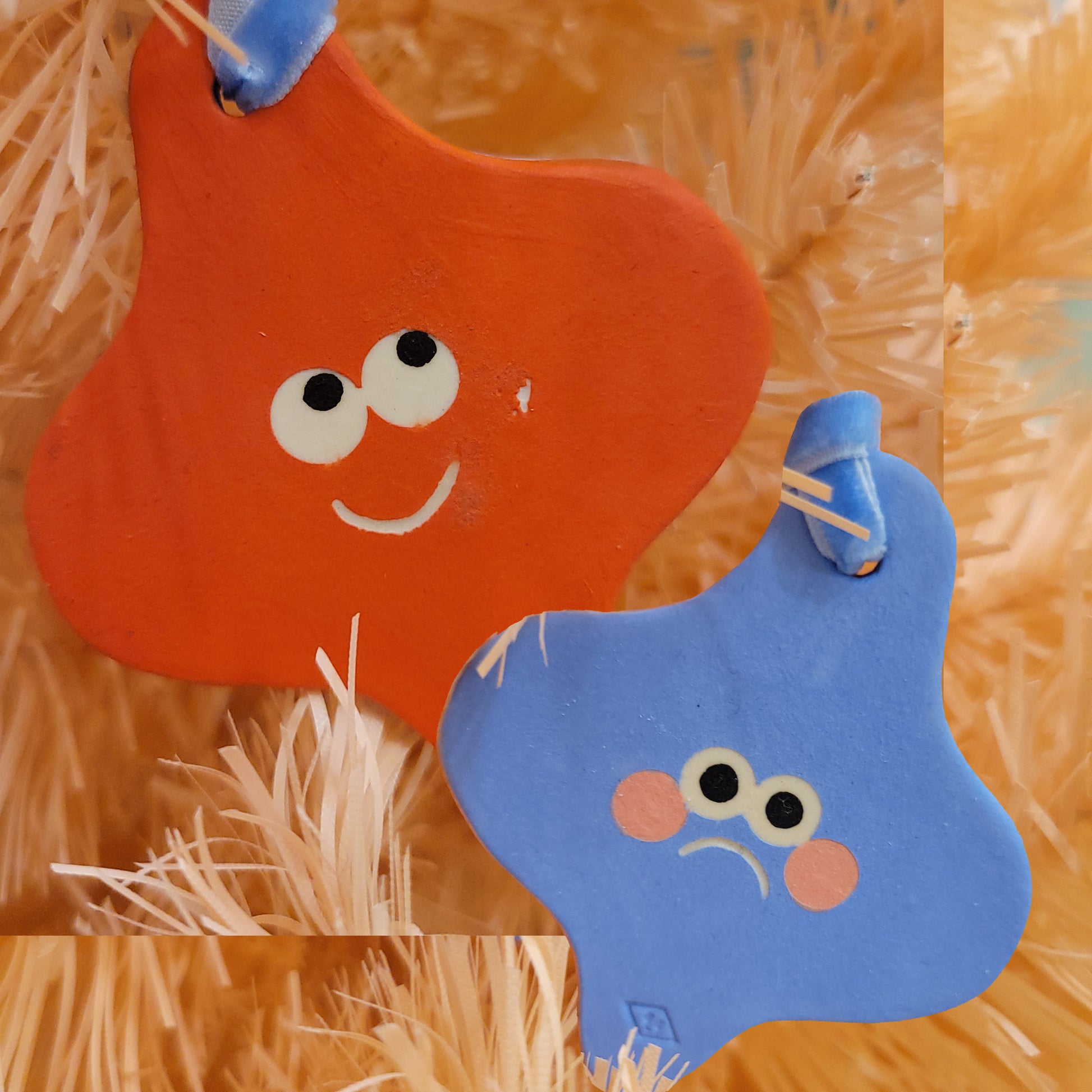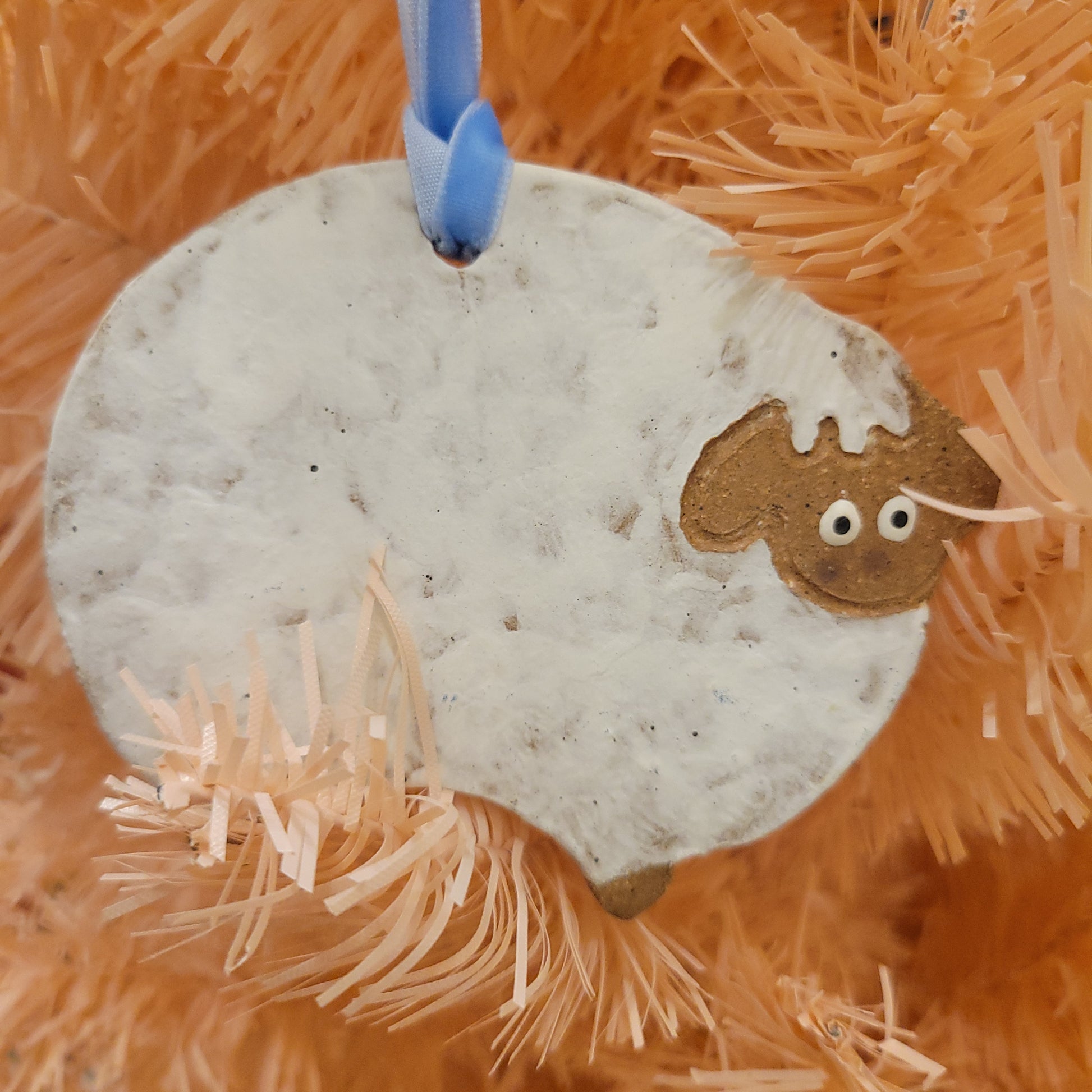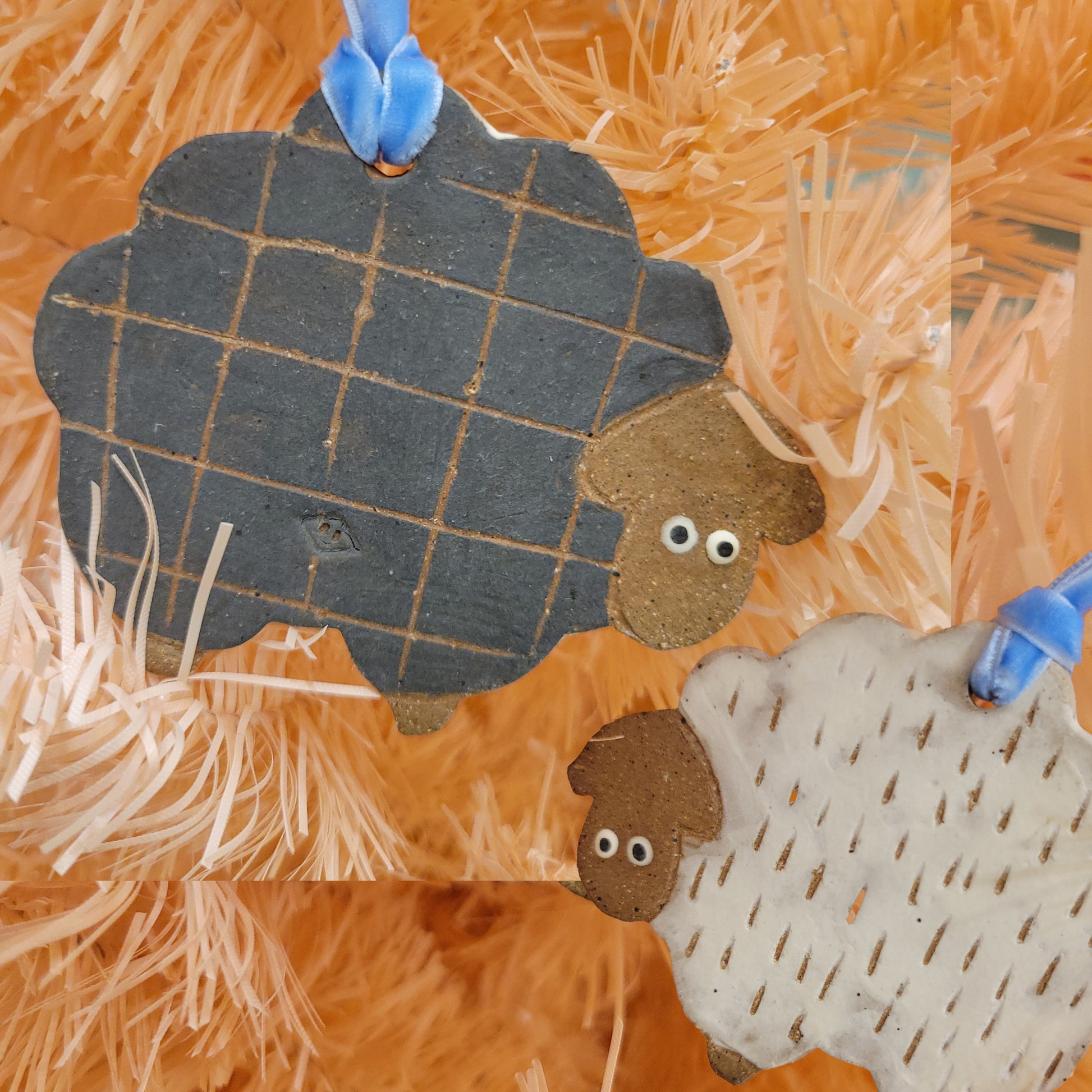 Each handmade ceramic ornament is double-sided and comes with a velvet hanging ribbon.