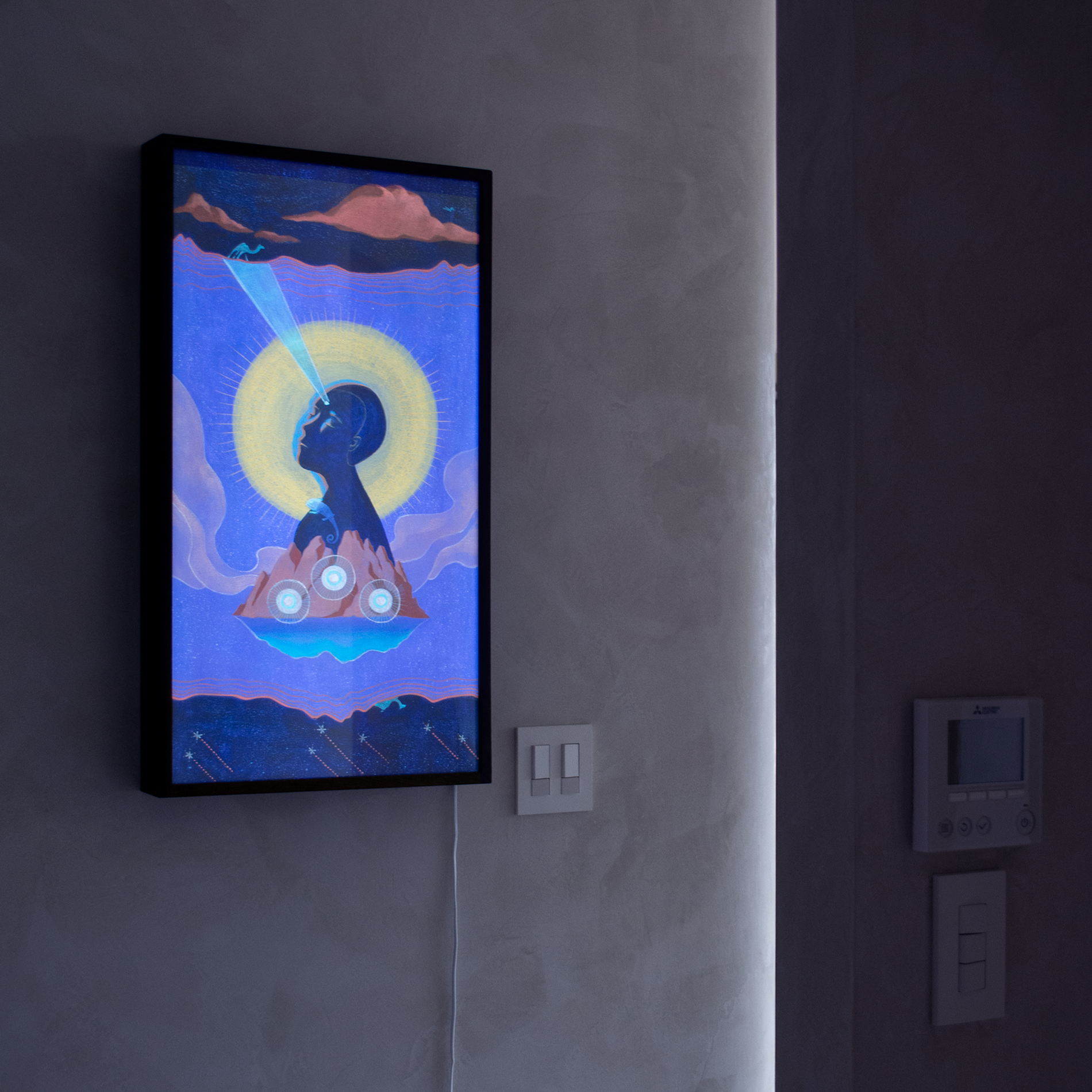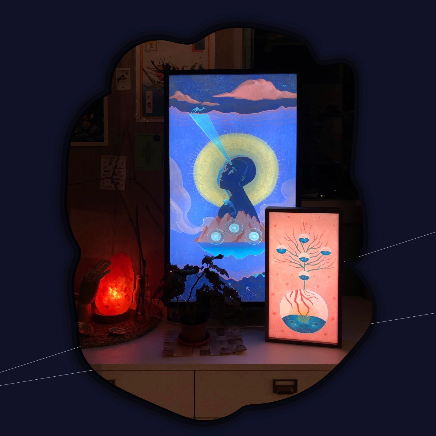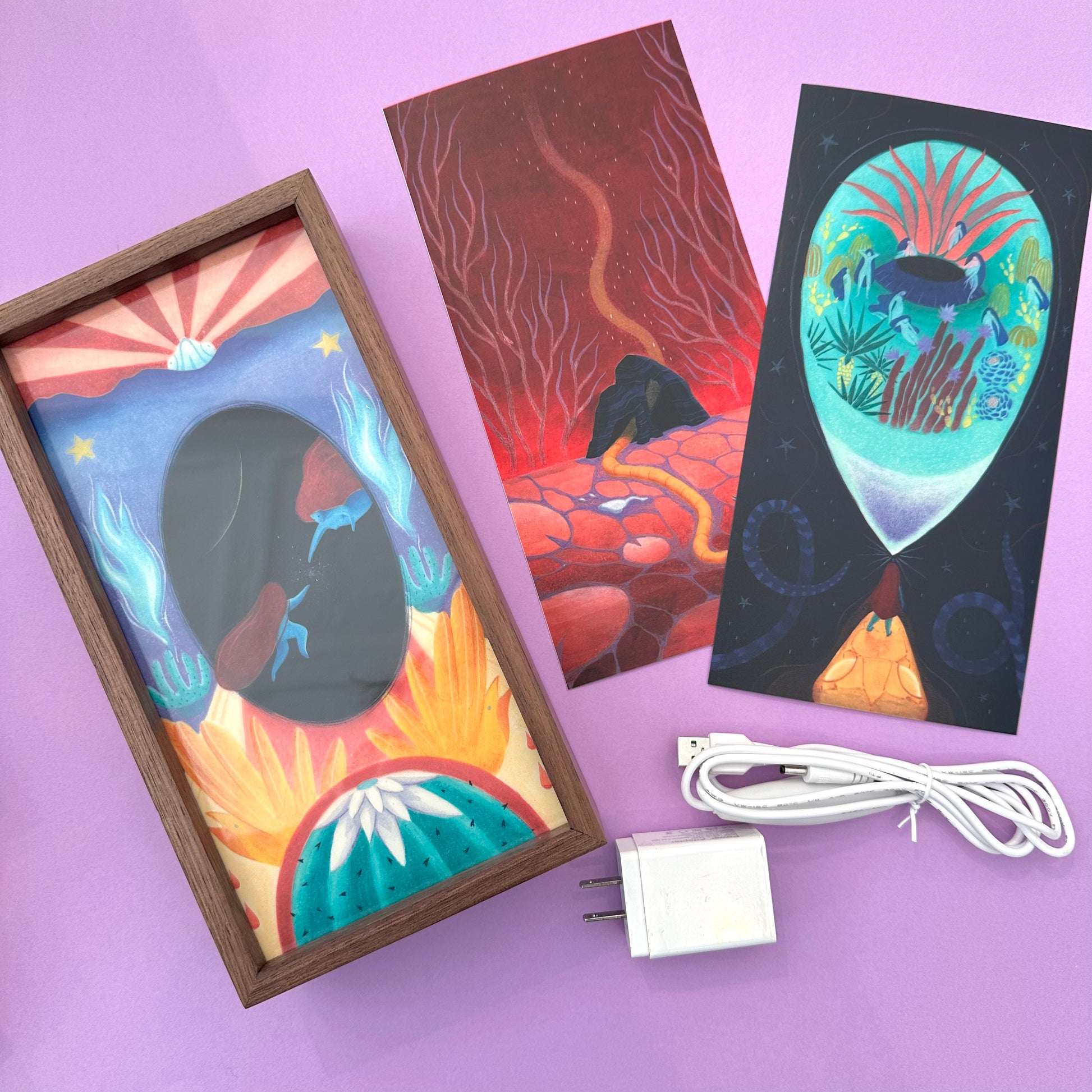 The Black Spring illustration series in a luminous form to shine any space that would embrace them. Each fine wood box comes with 3 interchangeable slides to rotate the featured artwork.